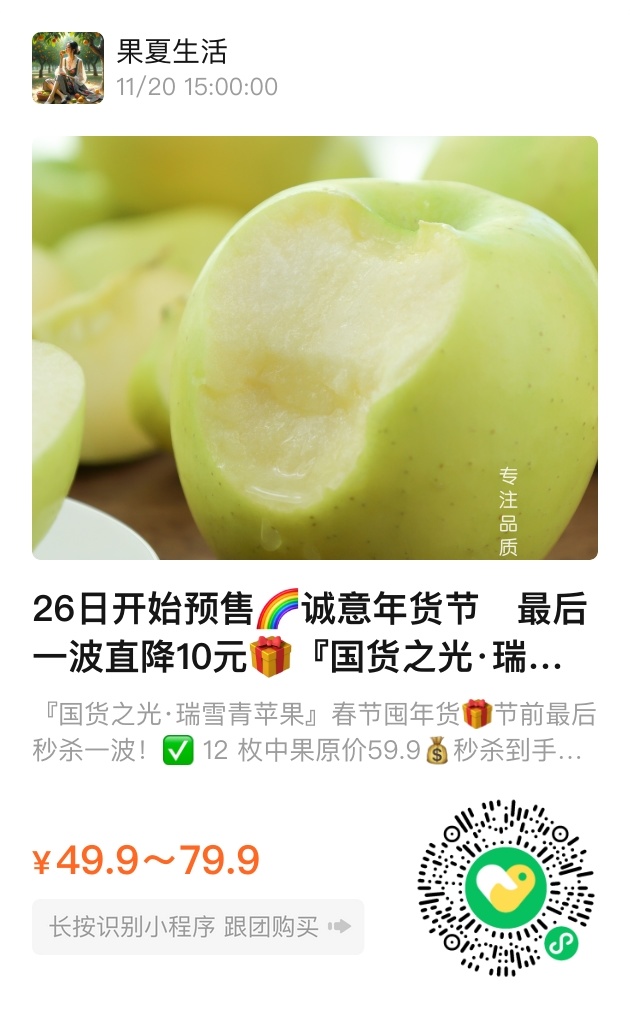 为了回馈忠实支持我们的顾客,特此推出一场诚意满满的『国货之光·瑞雪青苹果』年货节活动。在这个活动中,我们为大家准备了限时秒杀优惠:原价59.9元的12枚中果仅售49.9元,还有原价69.9元的9枚大果秒杀价仅需59.9元。这是一次不容错过的机会,仅限1月26日至1月30日,让更多家庭能在新春佳节里分享这一美味。