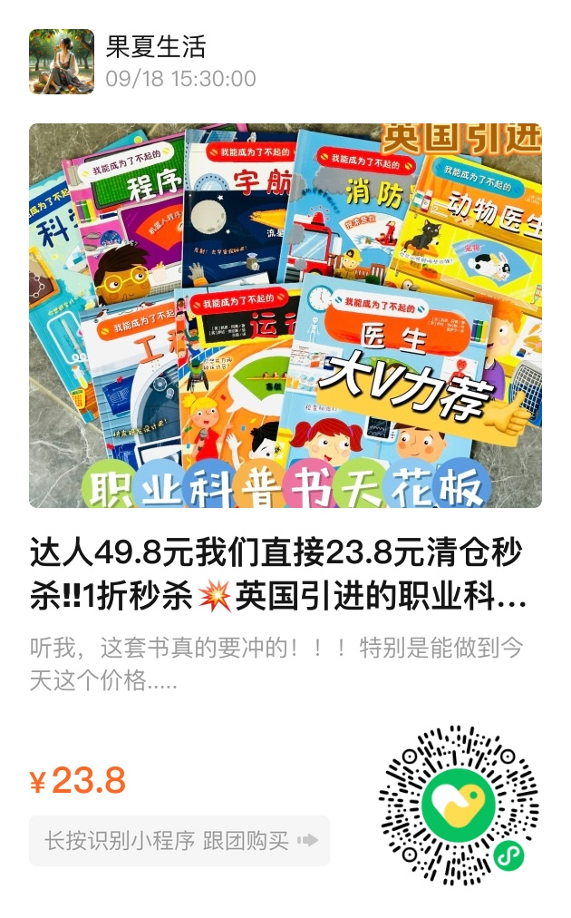 为了让更多孩子受益,这次我们以23.8元的清仓价提供这套书,远低于原价238.4元。希望能以此实惠的价格,帮助更多家庭在职业启蒙的道路上提供支持。这是一个千载难逢的机会,让孩子不仅读懂书本,更能读懂生活,我们诚邀您为孩子带回这份特别的礼物。