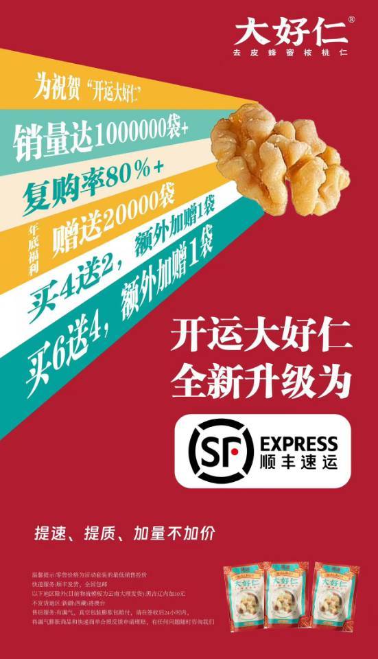为了感恩您的厚爱和我们的“开运大好仁”销量突破一百万袋这一巨大成就,我们特地推出了一项诚意满满的活动,让更多的您享受到我们的心意。每购买4袋核桃仁,不仅能额外获得2袋,我们还赠送1袋,让您在享受美味的同时感受到更多的实惠与贴心。